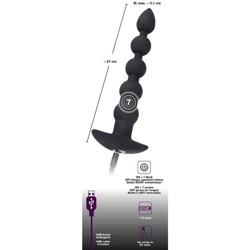 Анальная цепочка оснащена мощной вибрацией, которая насчитывает целых 7 различных режимов. Управление осуществляется кнопкой на основе. Там же находится и разъем для USB-кабеля, который поможет вам с легкостью зарядить игрушку. Зарядное устройство идет в комплекте. Время зарядки 70 минут, время работы 50 минут.