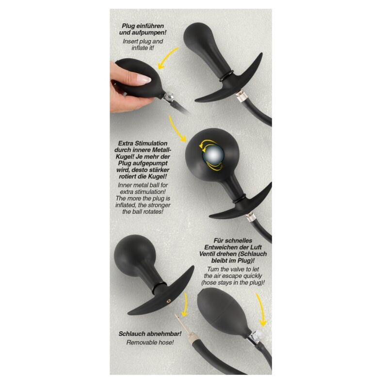 Вставьте пробку в анус в ненадутом состоянии. Небольшое количество смазки упрощает вставку и обеспечивает плавность работы. Затем с помощью груши насоса вы можете накачать пробку, пока она не достигнет желаемой толщины.