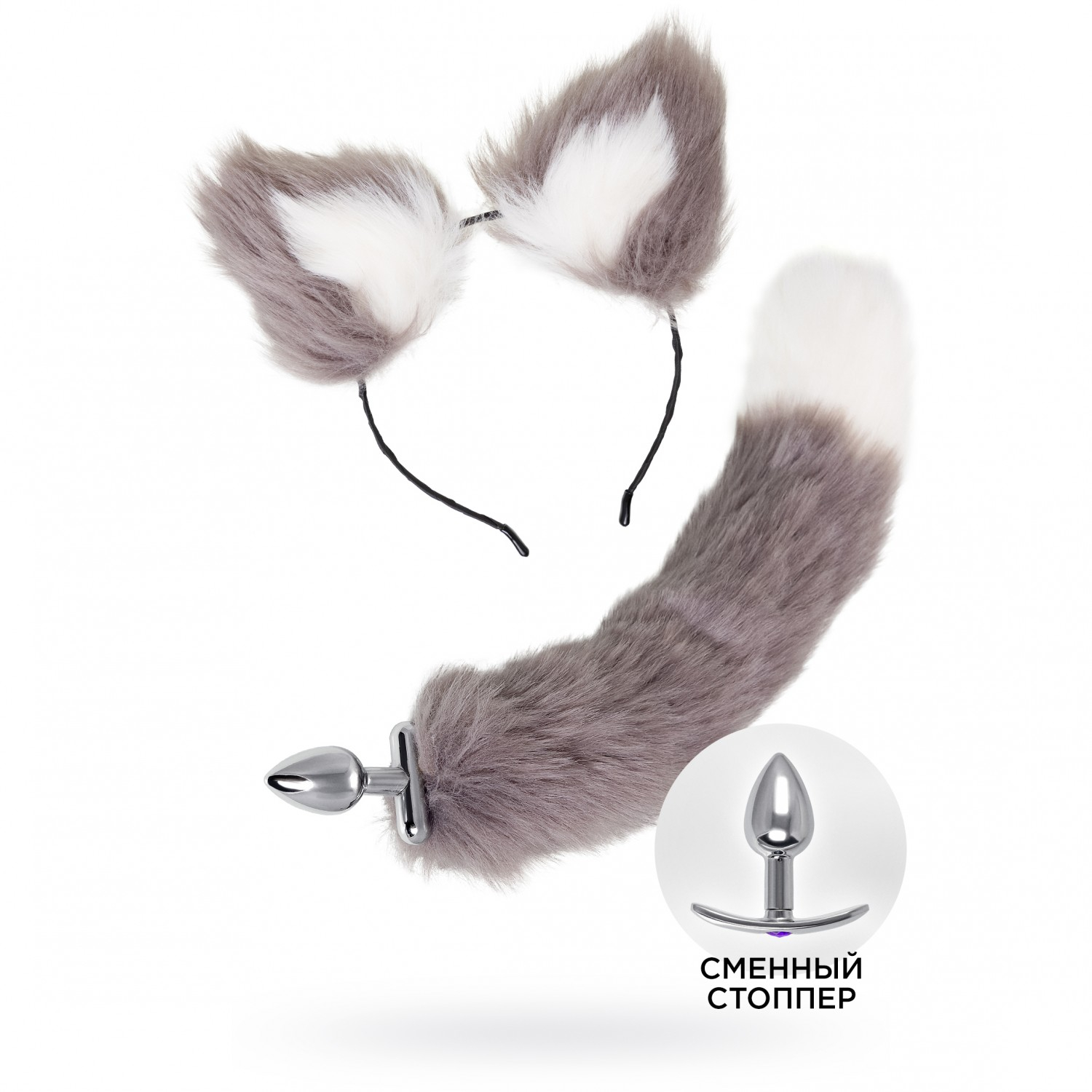 В комплекте: ободок с ушками, анальная пробка, 2 сменных ограничителя для пробки - хвост и дуга со стразом.