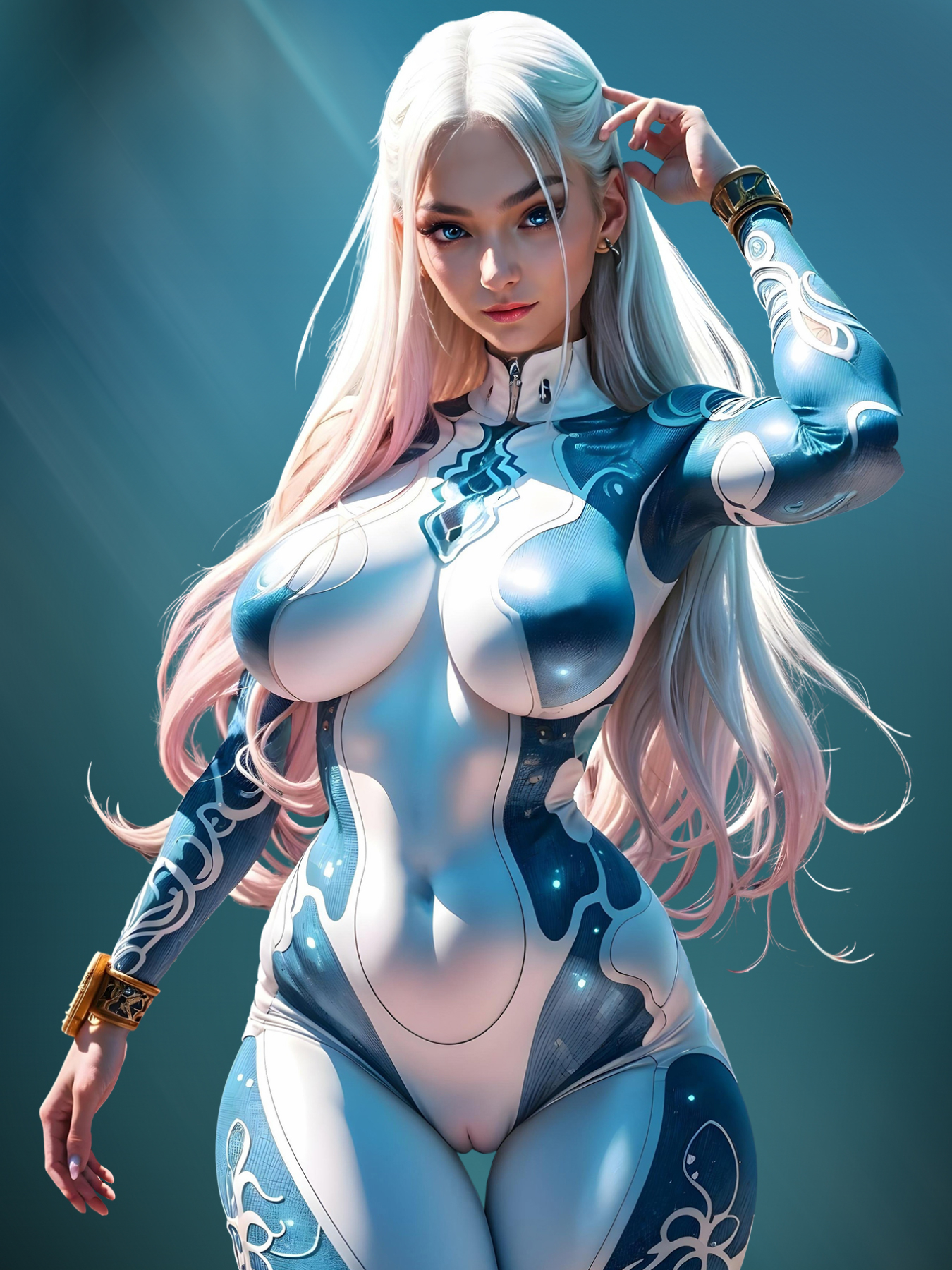 Представь: перед тобой Shiro Kaiji- героиня, будто сошедшая со страниц твоего любимого хентай. Белоснежные волосы рассыпаются по плечам, фарфоровая кожа мерцает в мягком свете, а глаза кокетливо-задумчивые словно зовут тебя ближе. Её стройная фигура в облегающем бело-голубом костюме подчеркивает грудь, талию и аппетитные бёдра. Она будто создана, чтобы играть с твоим воображением: невинность в её взгляде переплетается с дерзким обещанием, что дальше будет жарче.