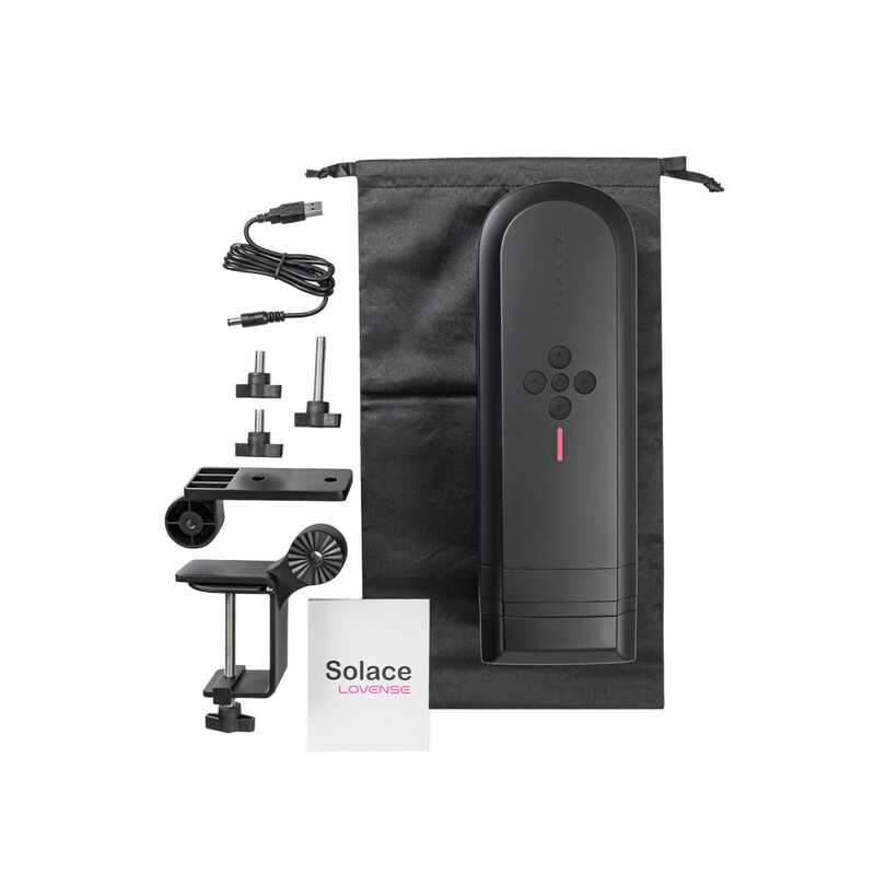 Комплектация: мастурбатор solace, рукав нереалистичной формы, зарядный кабель, настольное крепление, сумка для хранения и руководство пользователя.