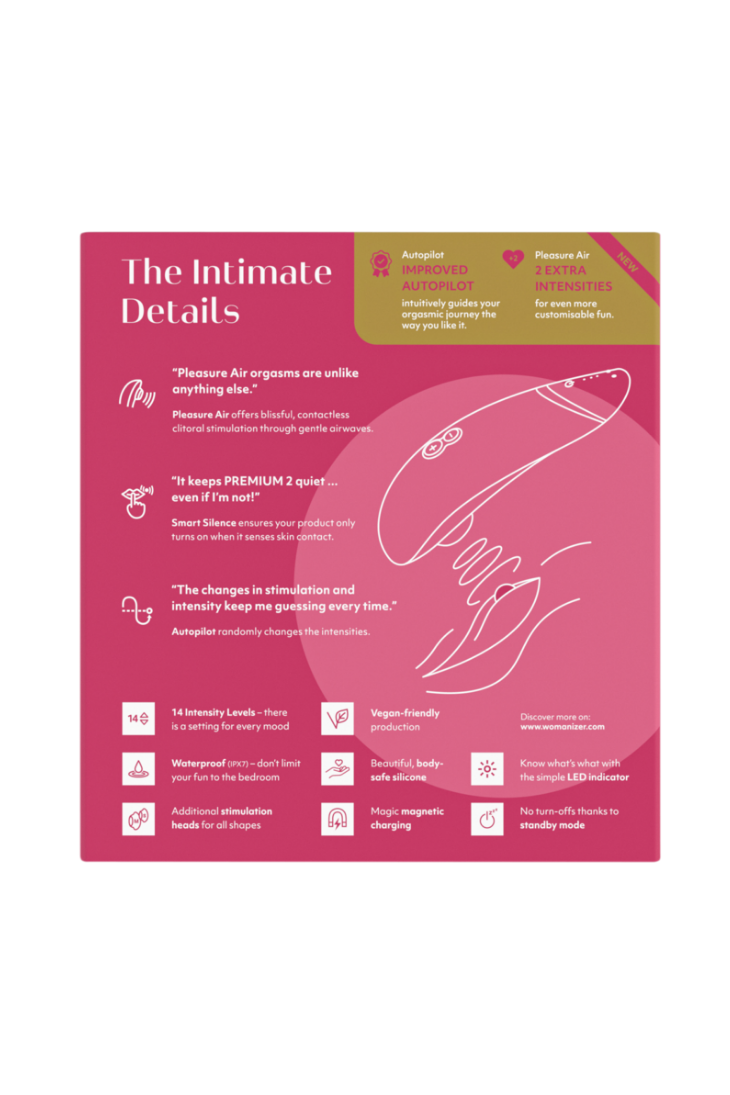 - Функция Smart Silence - Womanizer Premium начинает работать только при близком контакте с кожей и переходит в режим ожидания, стоит вам отложить его. Это не только делает работу устройства почти бесшумной, но дает вам возможность после интенсивного использования просто отложить игрушку в сторону, не беспокоясь о ее выключении.