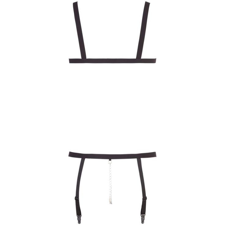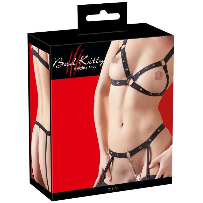 Эластичный откровенный комплект Bad Kitty Strap Bikini. Состоит из открытого лифа и трусиков-стрингов с пажами и цепочкой в шагу.