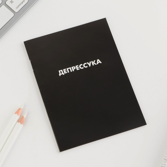 Обложка у блокнота мягкая, черного цвета с жизненной надписью: Депрессука.