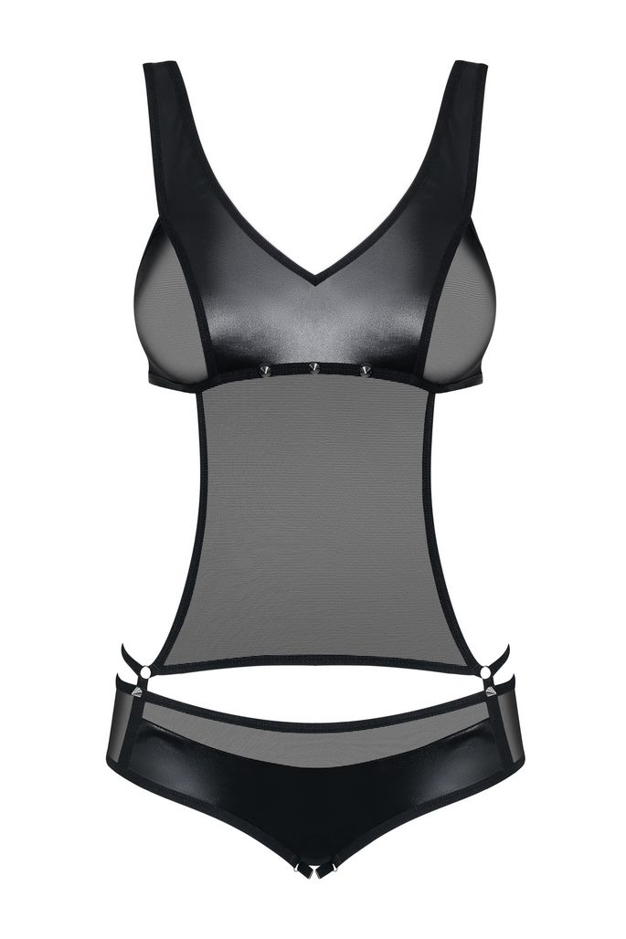 Сексуальное боди из гладкого глянцевого материала под кожу и вставками из прозрачной нежной микросетки. Такой силуэт боди стройнит фигуру. Это боди прекрасно подойдет для ролевых игр - попробуйте сыграть в нем госпожу и доминировать над партнером.