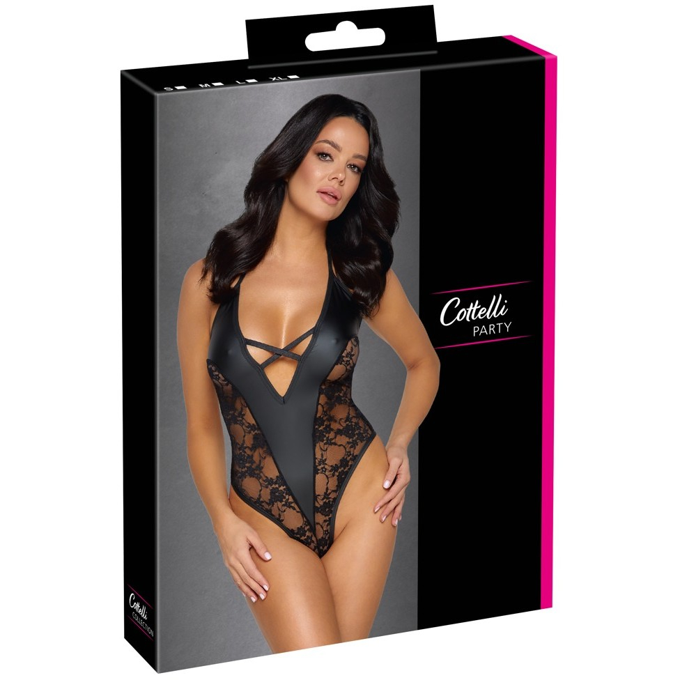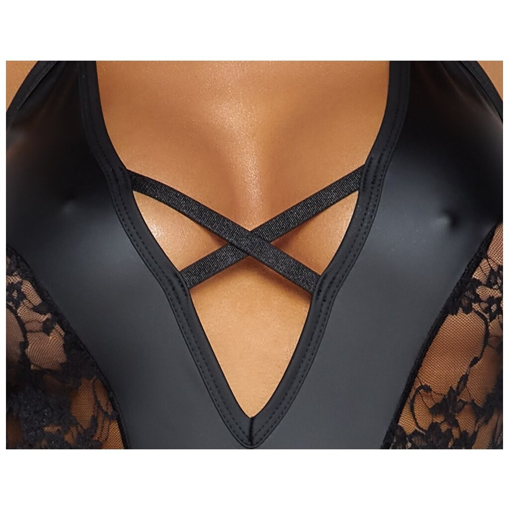 Боди сочетает нежное ажурное кружево и эластичную матовый материал, имитирующий эффект мокрой ткани, облегающей тело. Смотрится очень эффектно! Глубокое V-образное декольте боди дополнено скрещенными декоративными элементами, дополнительно привлекающими внимание к линиям тела. Бретели сходятся на шее сзади и могут регулироваться по размеру. В зоне промежность есть застежка на кнопках. Высокие проймы внизу идеально подчеркивают ваши бедра и ягодицы, а также визуально удлиняют ноги.