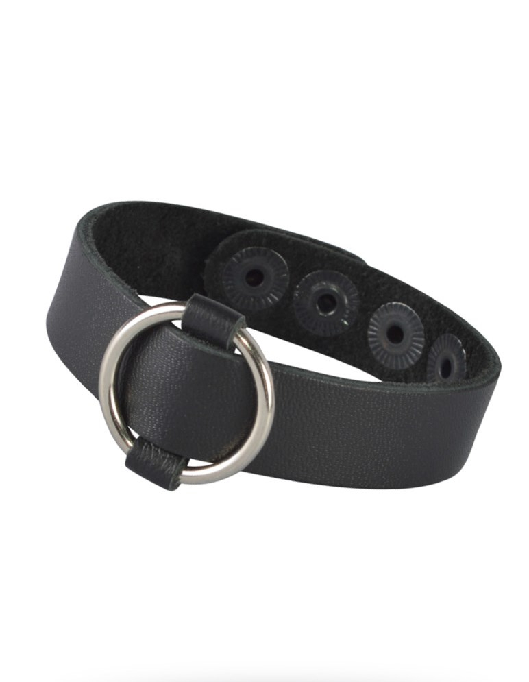 Браслет из натуральной кожи черного цвета украшен металлическим кольцом. Металлическое кольцо имеет никелевое покрытие.