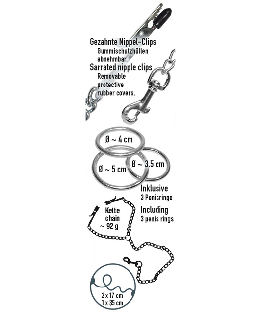 Комплект состоит из зажимов на соски и колец для пениса, соединенных между собой цепочками. Зажимы не регулируются и работают как прищепки, соеденены между собой цепью, на конце которой есть карабин, именно к этому карабину крепиться эрекционное кольцо из трех. На концах зажима есть резиновые накладки, что исключит травмирование сосков.