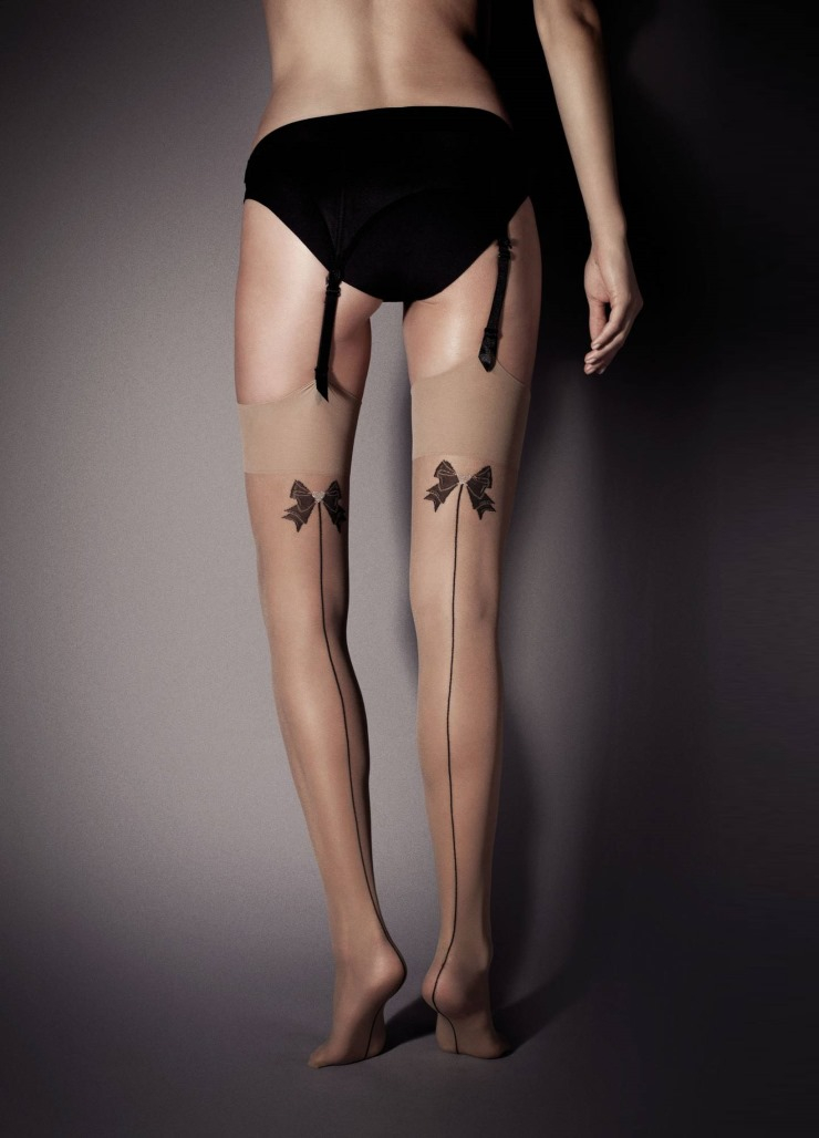 Фантазийные женские чулки под пояс с задним швом и рисунком в виде бантика. На широкой эластичной резинке.