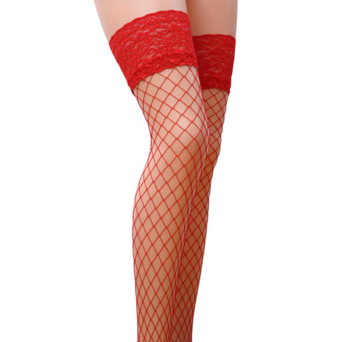 Ажурные чулки в крупную сетку на широкой кружевной резинке цветочного орнамента, ширина коронки 9 см.