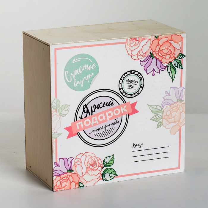 Коробка выполнена из дерева, крышка коробки открывается и декорирована красивым цветочным узором. Коробка оформлена в виде посылки.