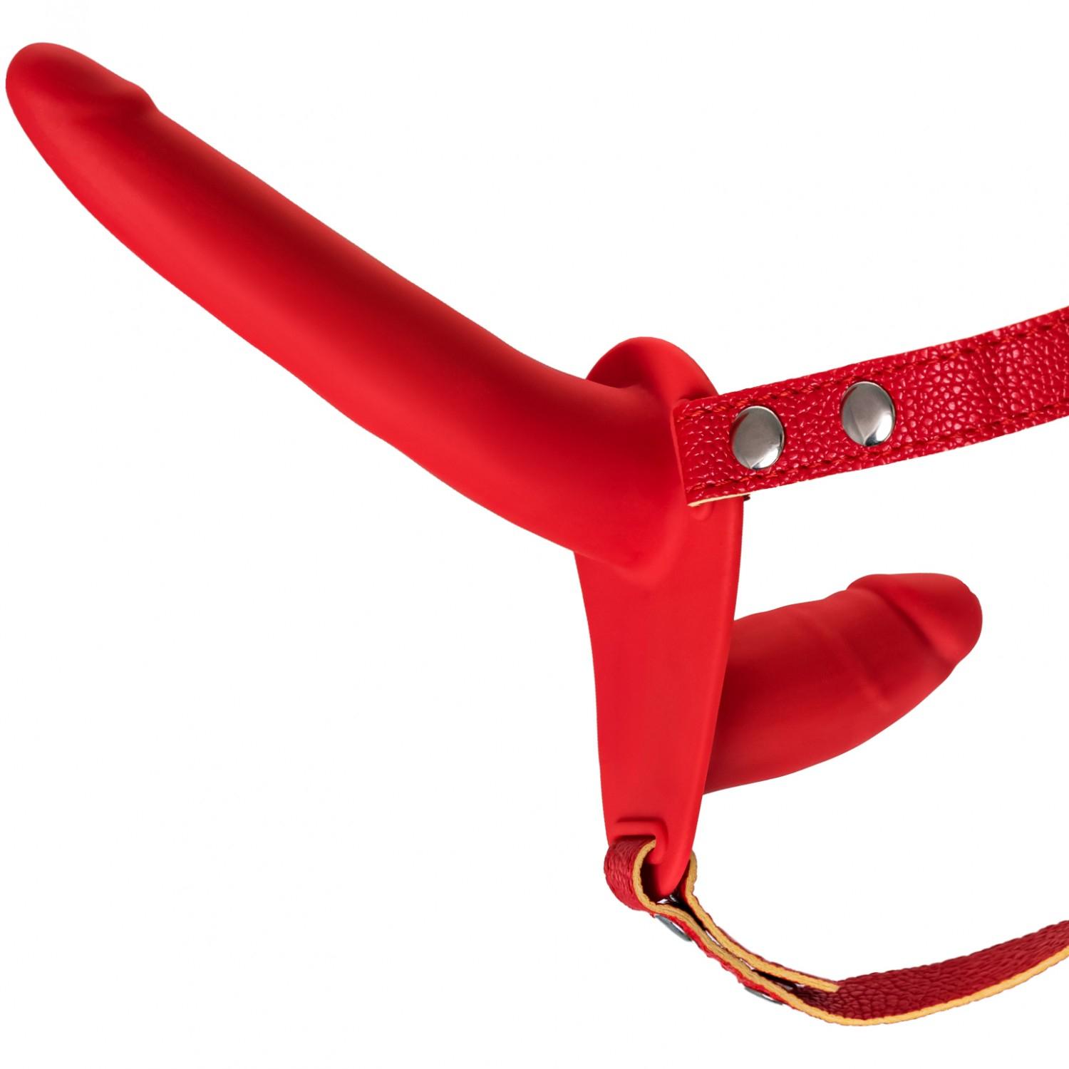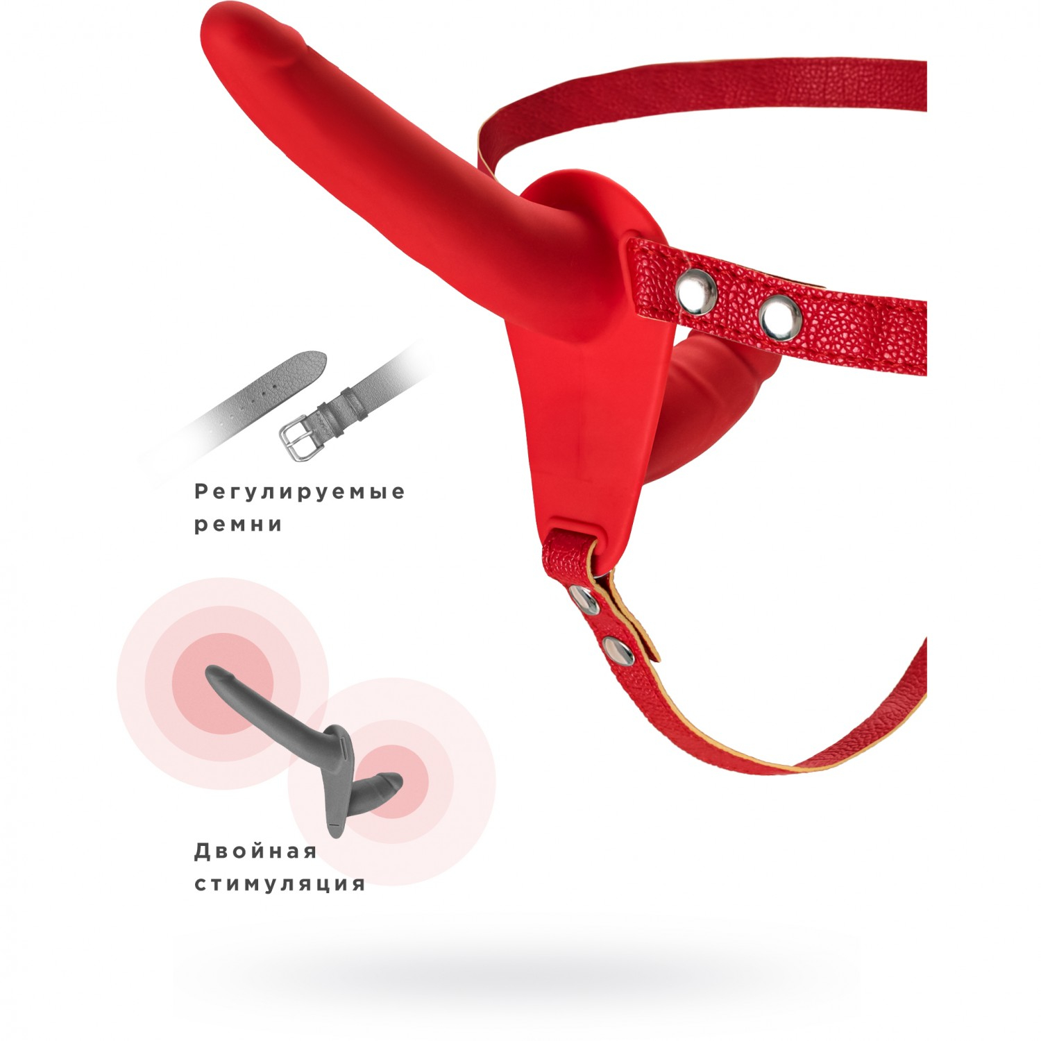 Страпон фиксируется тремя тонкими ремешками из PU-кожи и регулируется пряжками. Рекомендуется использовать с лубрикантом на водной основе.