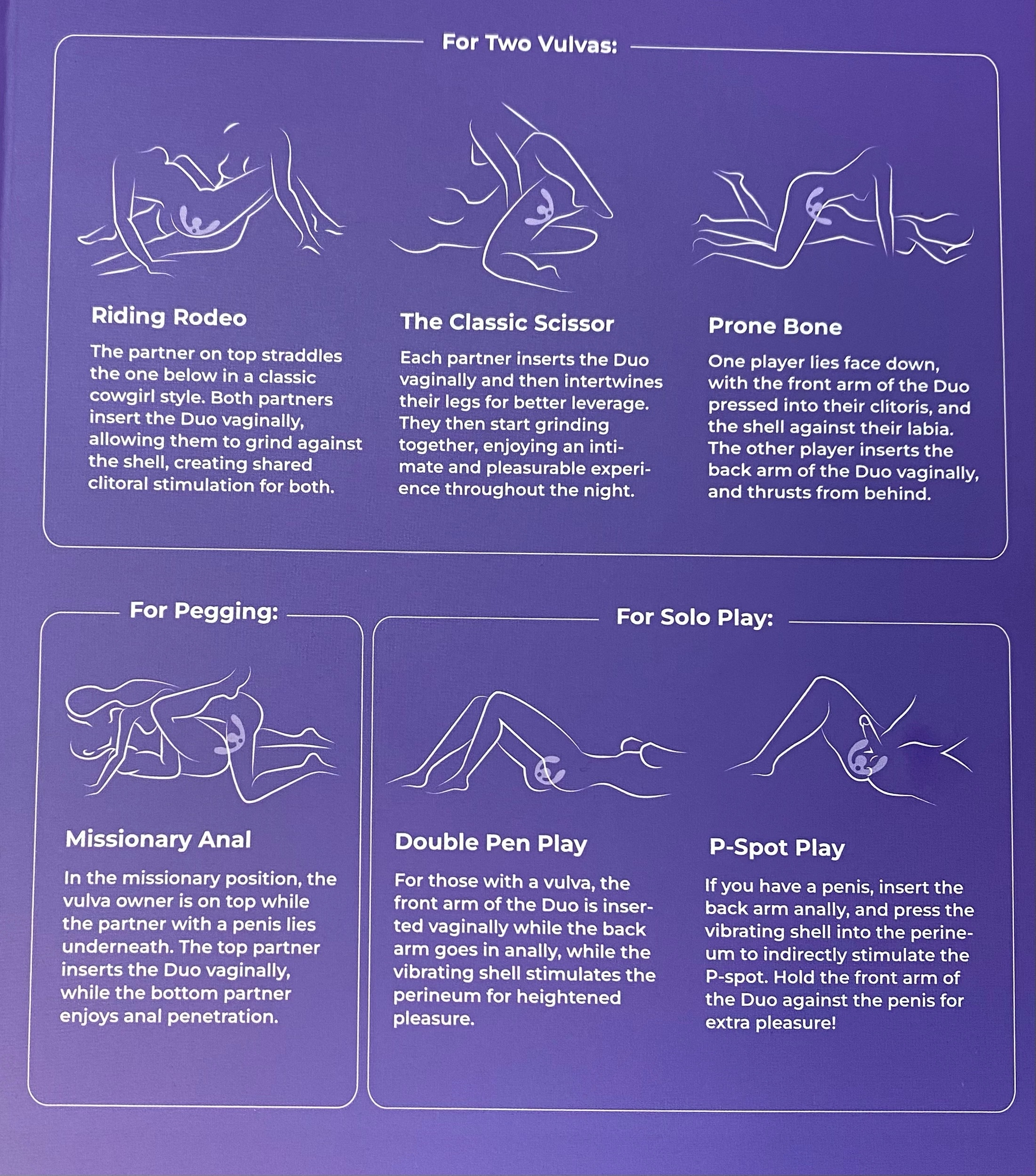 1. Смена власти: не активный партнер вводит один конец вагинально, при этом гудок по середине стимулирует ему клитор, а второй отросток стимулирует партнера + добавляем фрикции и вот синхронизировались в удовольствии. Можно попробовать позу ложечки или догги-стайл