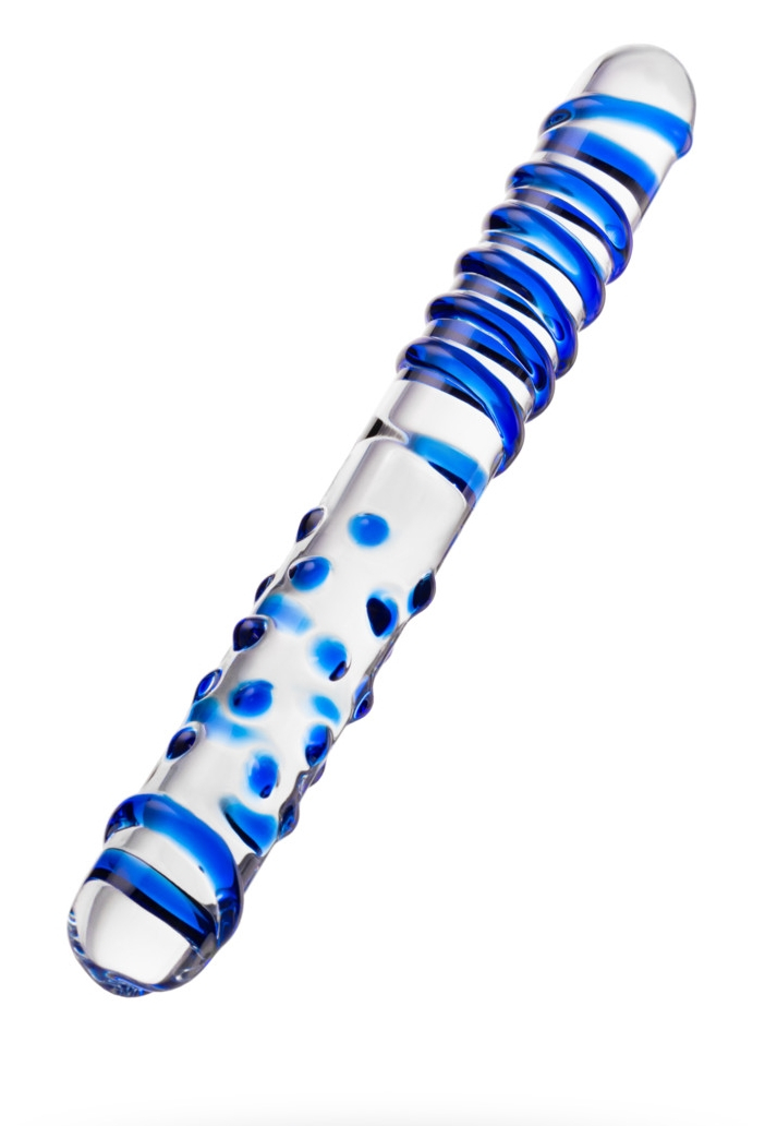 Двусторонний прямой жезл-стимулятор с объемными массажными точками на одной половине и рельефной спиралью - на другой может служить и как стимулятор ануса и как вагинальный массажер. Массажные точки и спираль выполнены синим цветом.