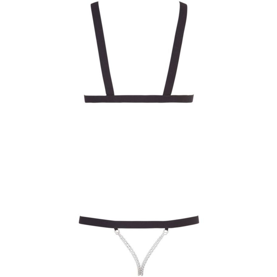 Горячие игры в бондаж запрограммированы в этом черном боди из эластичных стрепов! Особенно завораживают две блестящие съемные цепочки проходящие через промежность.