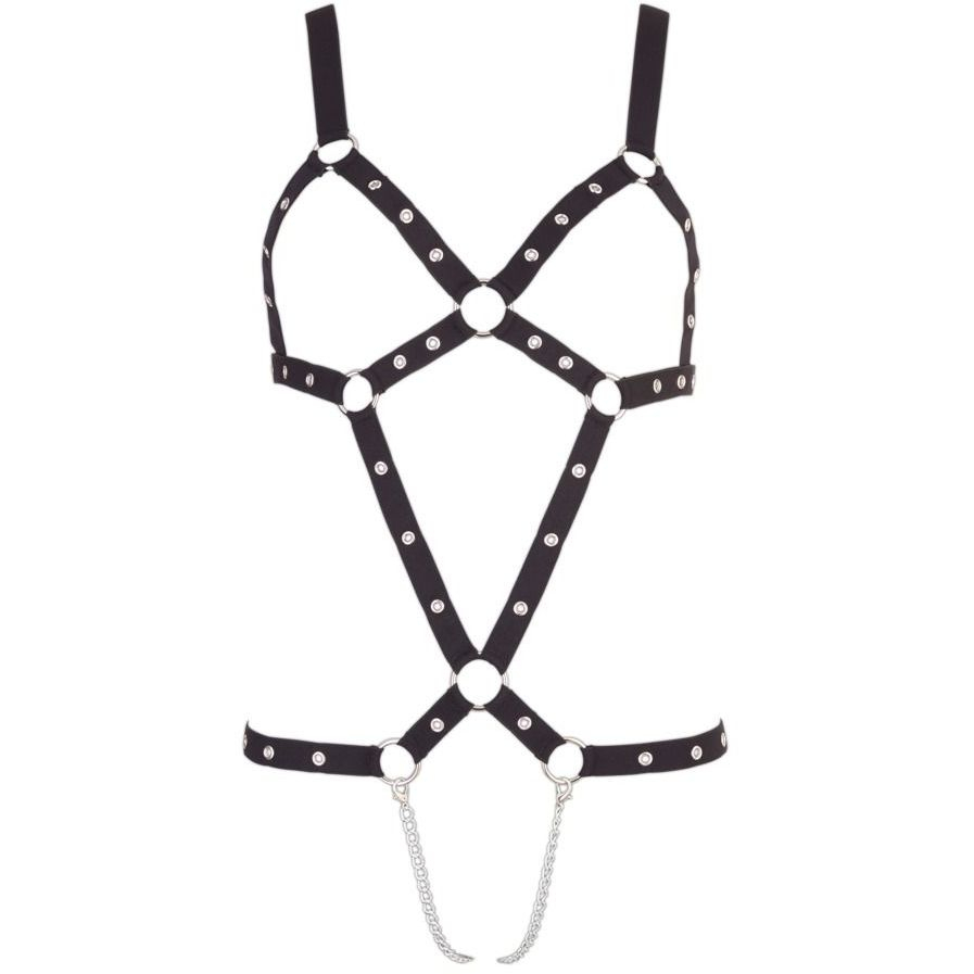 Черное боди сделано в виде эластичных ремней, соединенных между собой металлическими кольцами. Боди декорировано металлическими клепками, а интимной зоне украшено металлическими цепочками с небольшими звеньями.