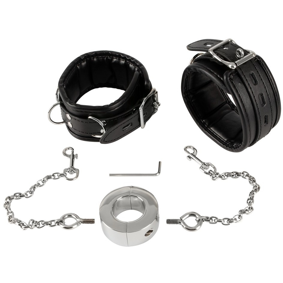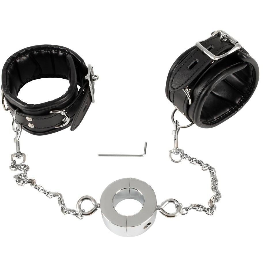 Наручники и кольцо для члена от fetish collection: наручники плюс кольцо для пениса из нержавеющей стали с двумя плотно закрепленными короткими карабиновыми цепями для зацепления за наручники.