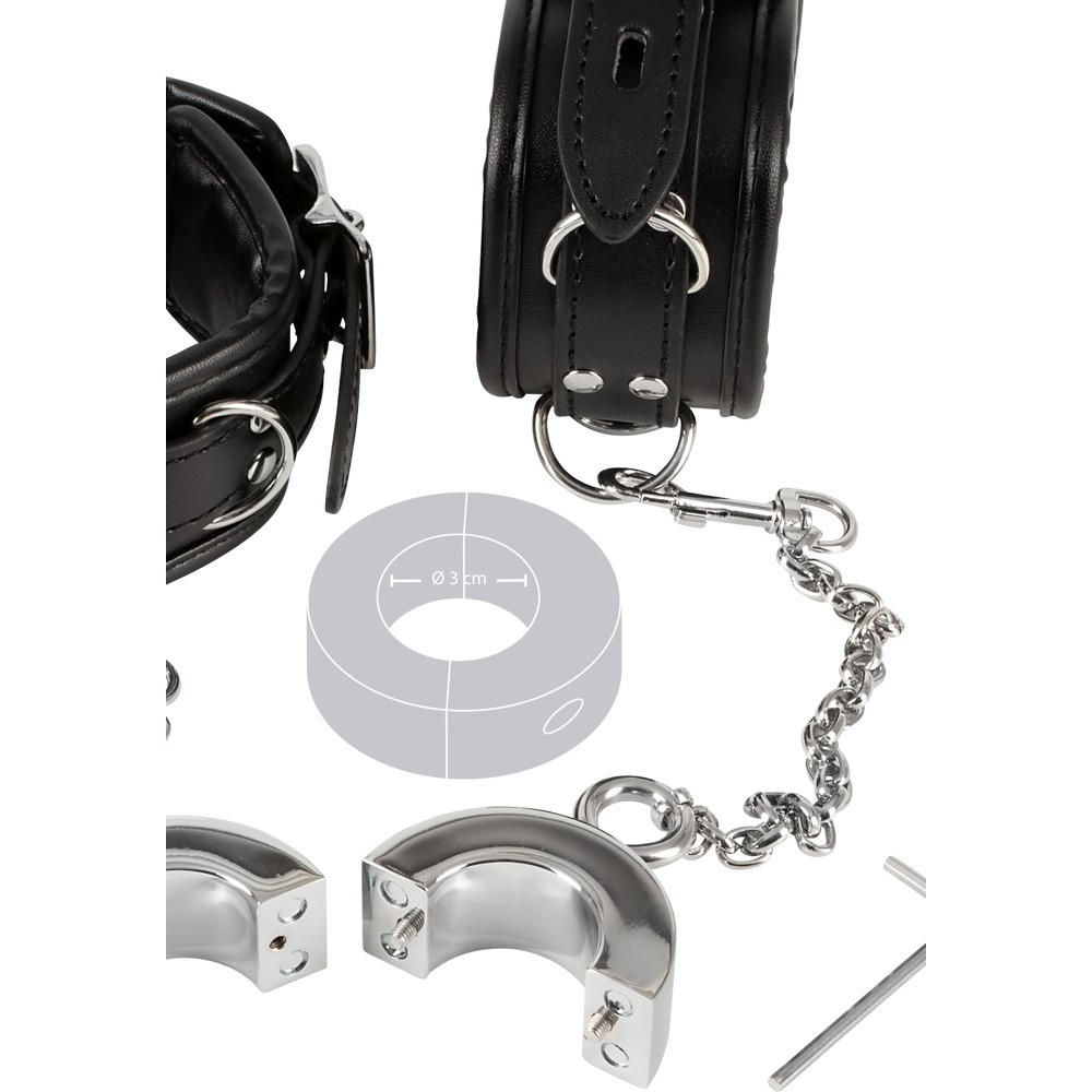 Наручники с мягкой набивкой и стильным кожаным дизайном регулируются с помощью застежек-пряжек в соответствии с размерами от 17 см до 29 см.