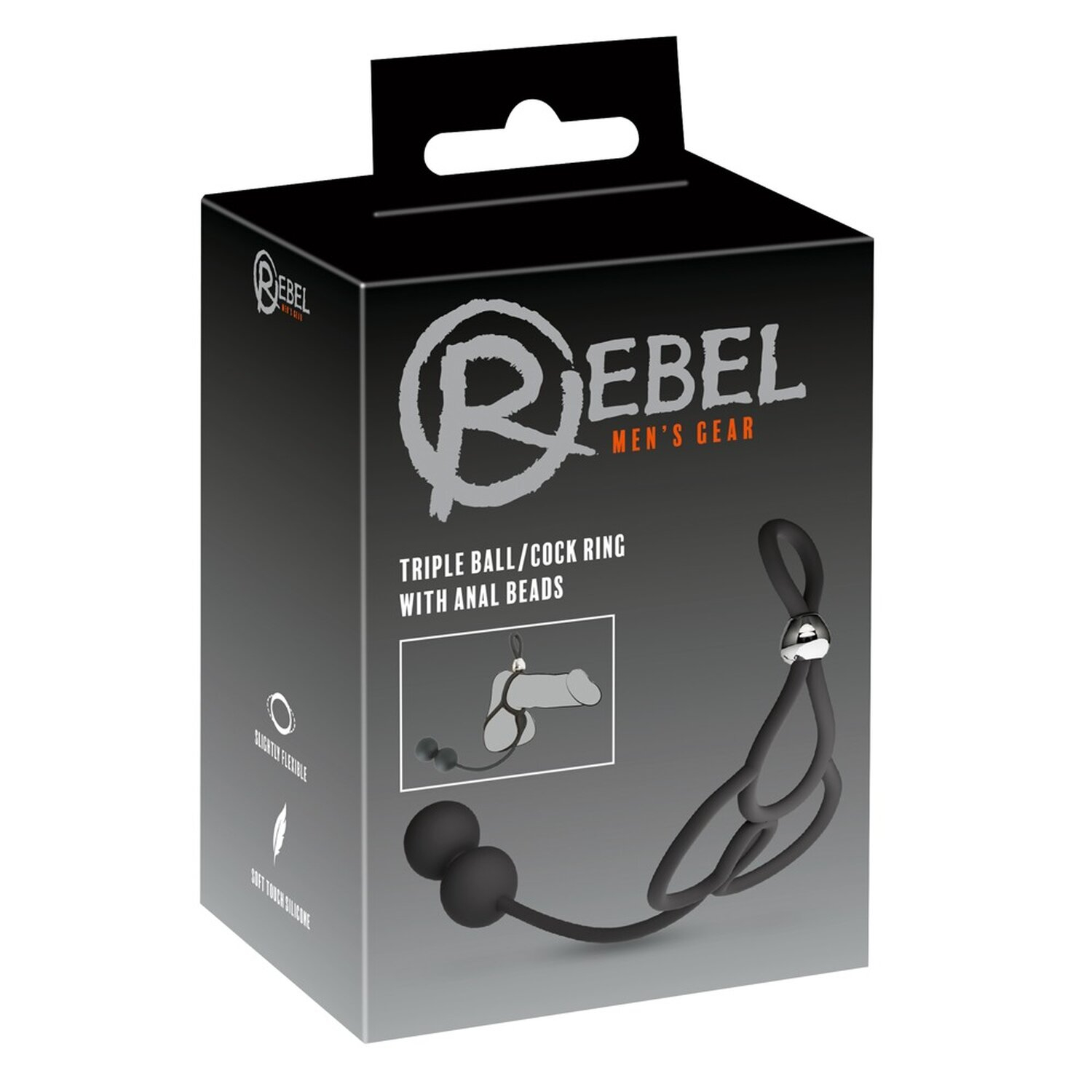 Комбинированное кольцо для члена и мошонки с анальными бусинами от Rebel закрепленными на нити. Регулируемое по размеру кольцо для полового члена, а также два эластичных кольца для яичек плотно захватывают его лучшие части и могут эффективно поддерживать эрекцию благодаря эффекту притока крови, без оттока. В то же время два введенных анальных шарика обеспечивают интенсивную стимуляцию ягодиц. Гибкая соединительная нить плотно прилегает к промежности, обеспечивая дополнительную стимуляцию.