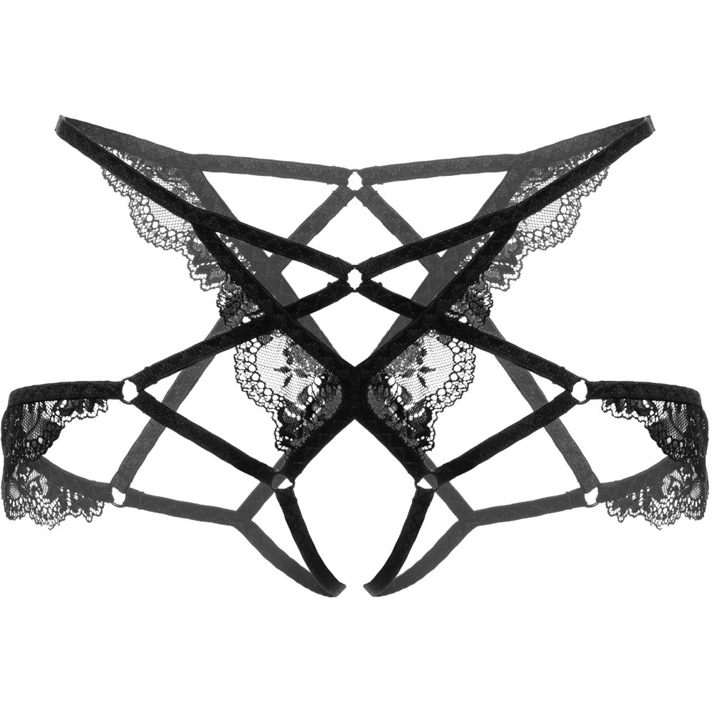 Эластичные стрепы подчеркивают манящую привлекательность бедер. Миниатюрные кольца и вставки из тонкого кружева соблазнительно украшают почти обнаженное тело. А интригующий доступ к интимной зоне позволяет воплощать в жизнь десятки горячих сценариев, не снимая при этом трусики.