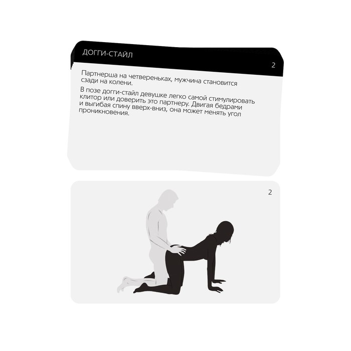 В наборе есть 5 карт с описание поз, они слегка внесут разнообразие в ваши обычные позы, а также эти позы очень удобны с использование анальных втулок.