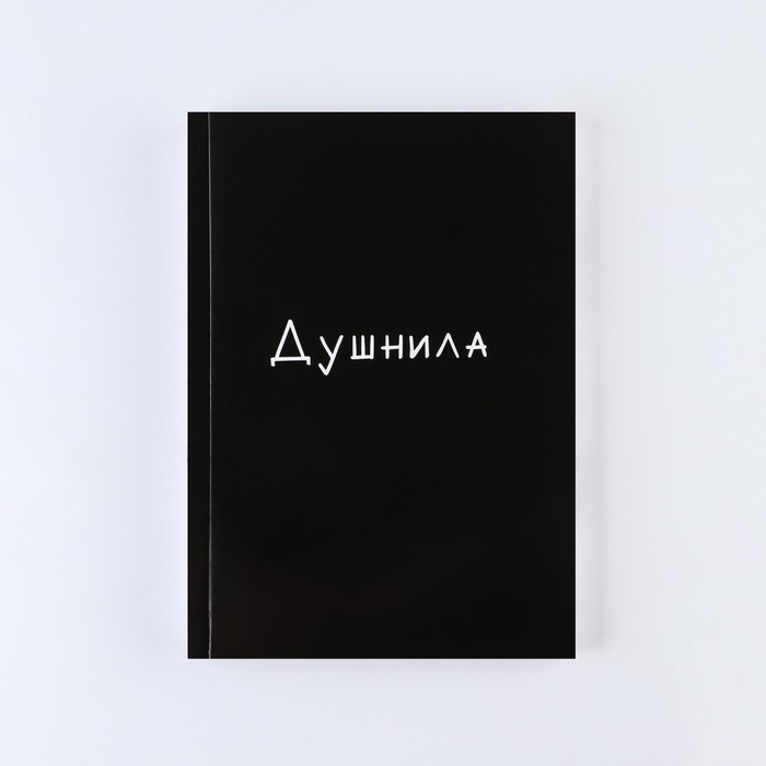 Мягкая картонная обложка черного цвета с надписью Душнила. Размер ежедневника А5. 160 листов