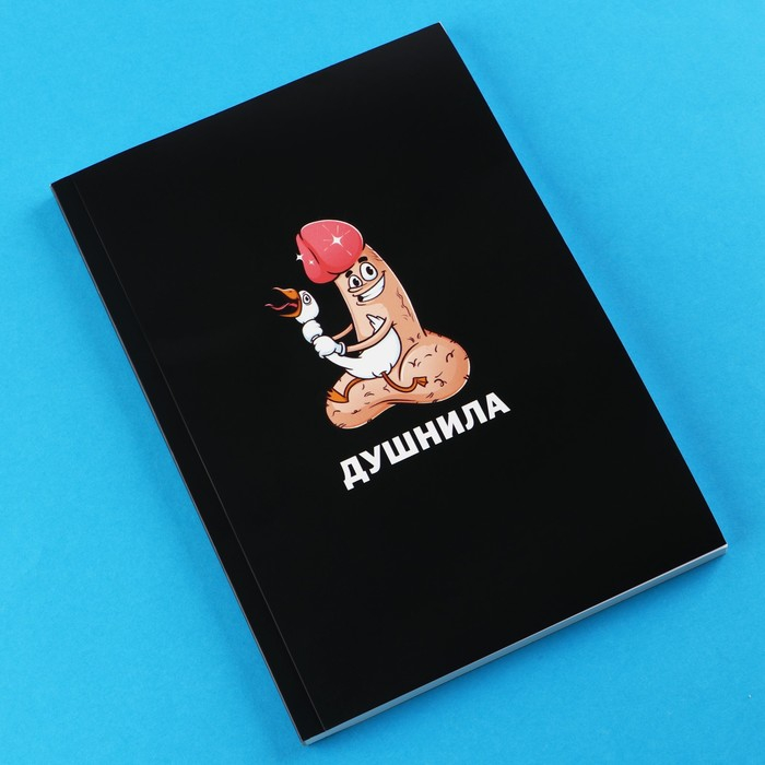Мягкая картонная обложка черного цвета с надписью Душнила. Размер ежедневника А5. 80 листов