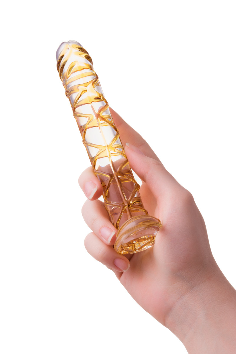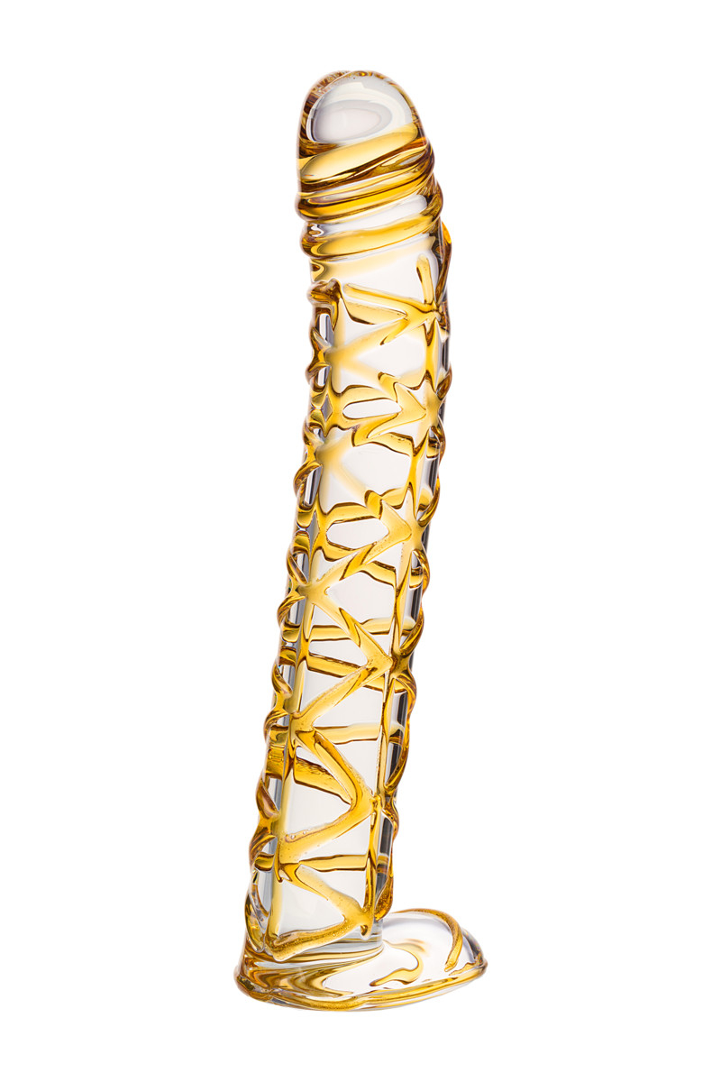 Элегантный дизайн, уникальное художественное оформление. Стекло - наиболее гипоаллергенный из всех существующих материалов. Легко нагревается и охлаждается для экспериментов с температурой. Очень прост в уходе благодаря гладкой, непористой поверхности. Фаллоимитатор весь усыпан желтыми венками для более интенсивной стимуляции, головка чуть-чуть загнута для стимуляции точки G. В основании фаллоимитатора есть плоская платформа или стопор, по-этому игрушку можно использовать анально.