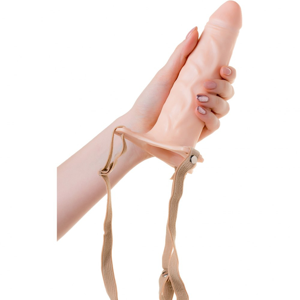 Пустотелый фаллопротез телесного цвета с регулируемыми ремешками.