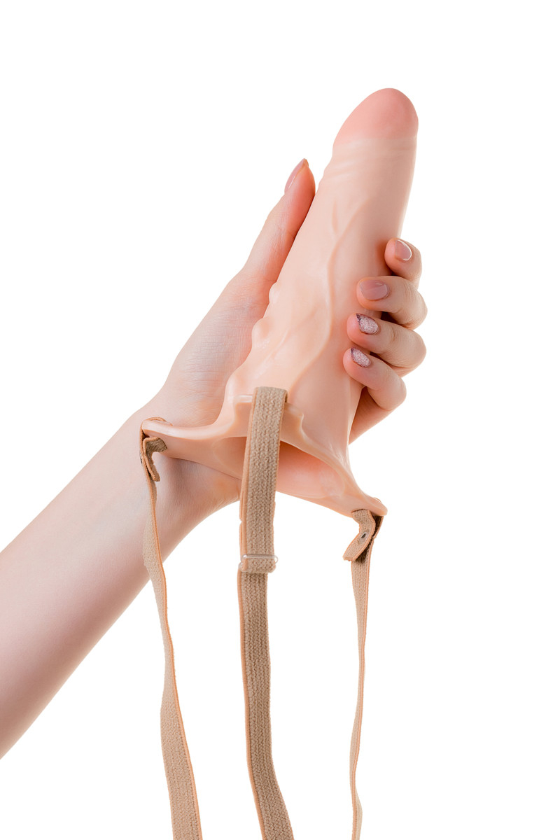 Пустотелый фаллопротез телесного цвета с регулируемыми ремешками.