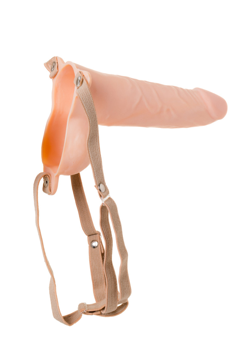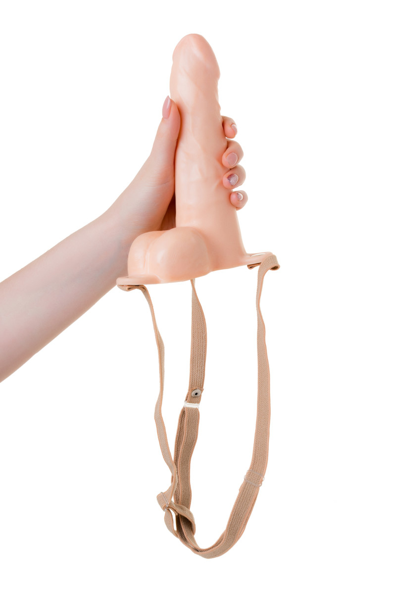 Пустотелый фаллопротез с мошонкой телесного цвета с регулируемыми ремешками. Игрушка выполнена из ПВХ, мягкого, но довольно упругого материала, чтобы держать форму.