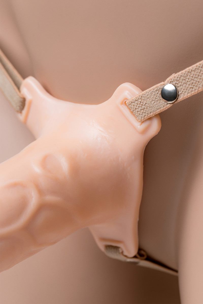 Пустотелый фаллопротез телесного цвета с регулируемыми ремешками.