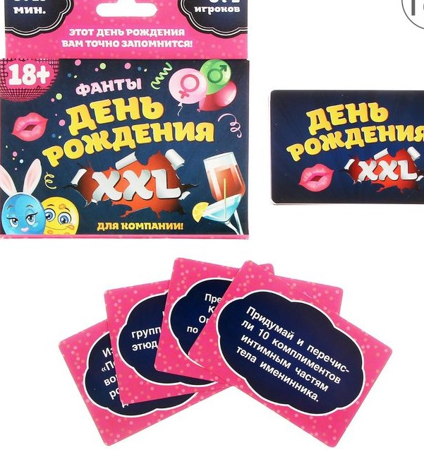 По очереди вытягивайте карточки с фантами и выполняйте задания. В игре действует только одно правило: долой смущение! Сегодня предстоит удивлять и возбуждать друг друга: дарить пикантные комплименты, откровенно танцевать и даже пробовать на вкус самые сексуальные части тела именинника!