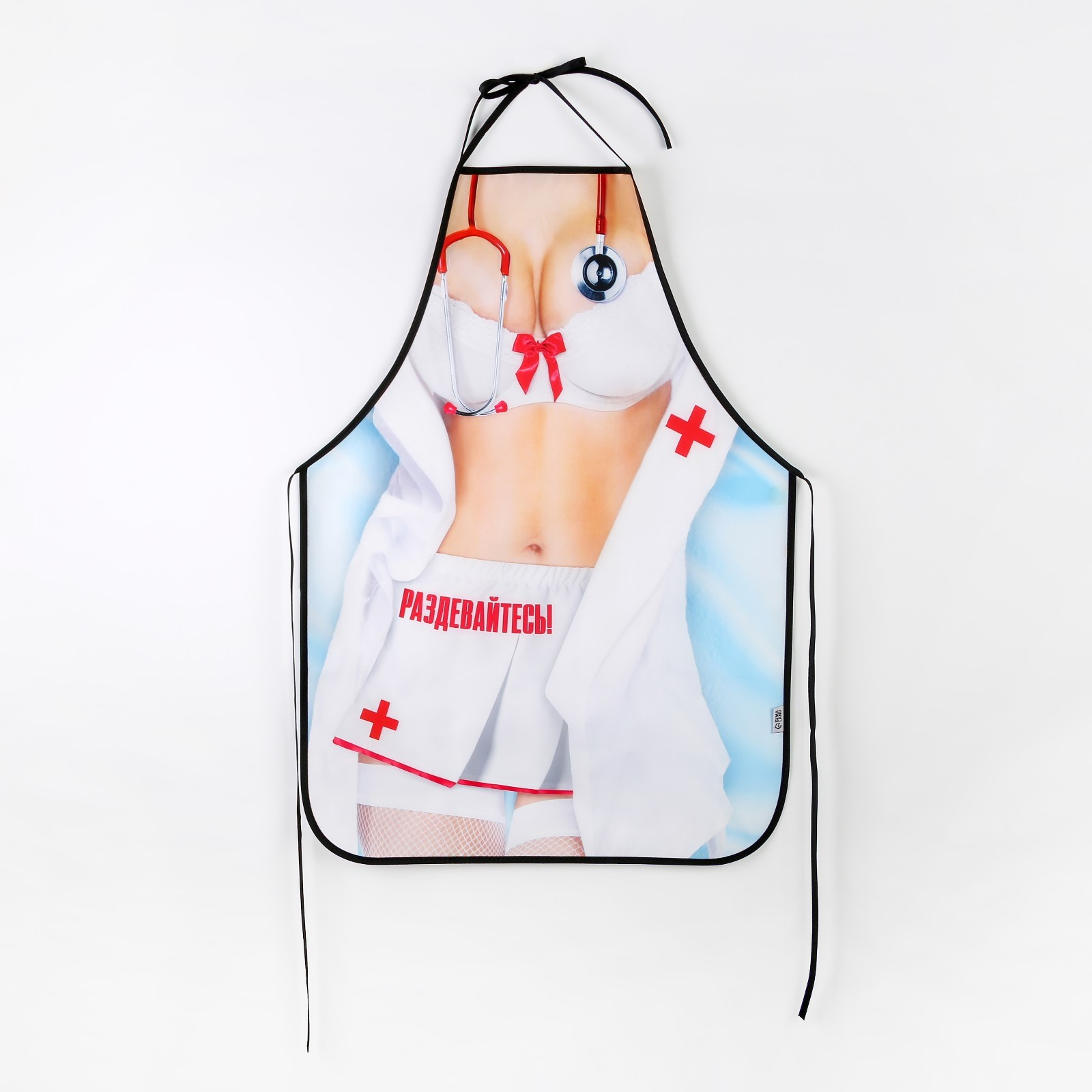 Представьте: вы готовите ужин, а ваш гость не может оторвать взгляд от вашего фартука. На нём очаровательная медсестра в соблазнительном образе, которая словно приглашает на особое обследование.