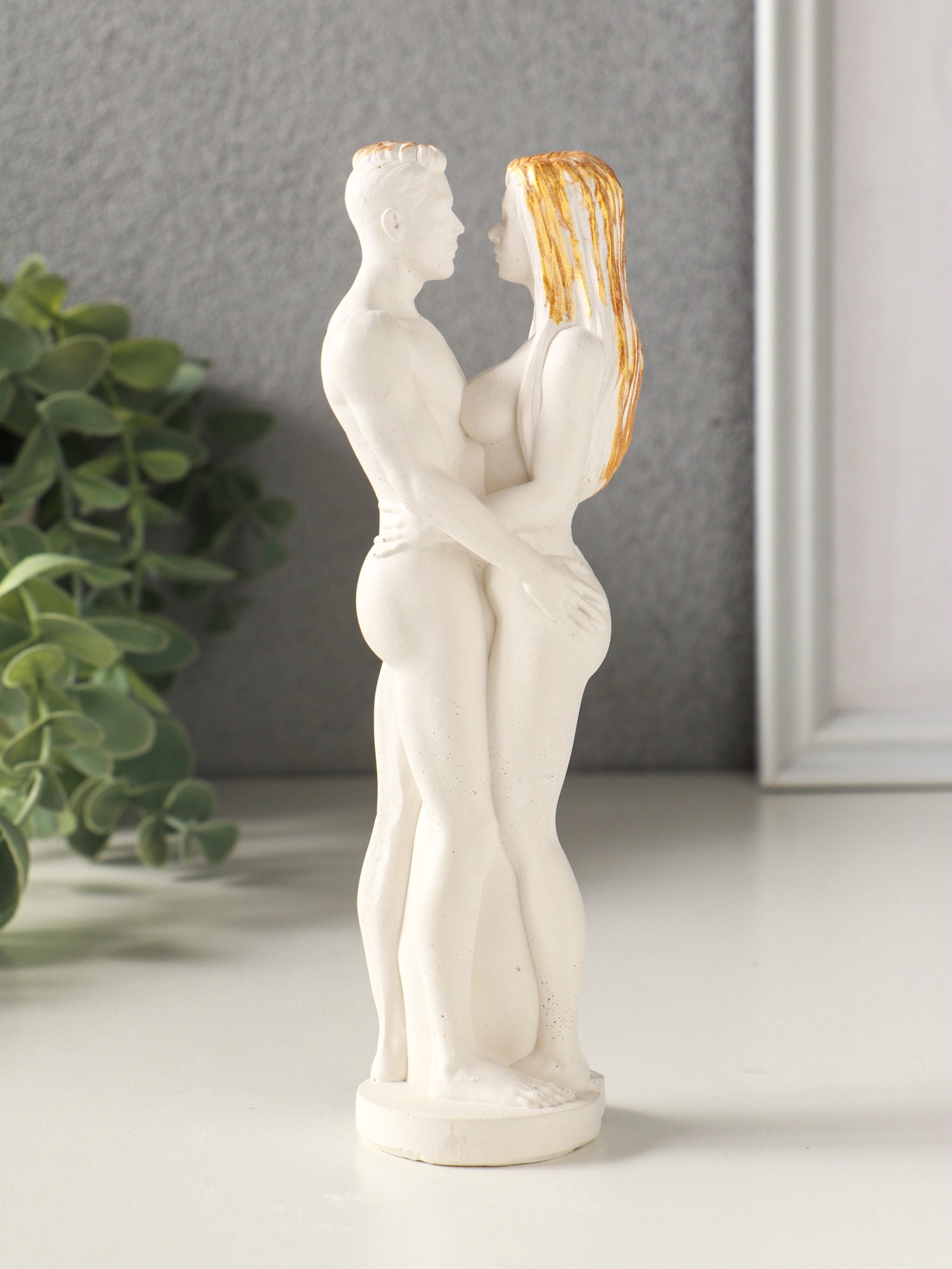 Эта изящная гипсовая фигурка влюблённой пары тонкий акцент для самого тёплого праздника. Белоснежная основа с позолотой создаёт ощущение лёгкости и торжественности, превращая скульптуру в немой, но красноречивый символ чувств. Она говорит о любви без слов, подходя для дня всех влюблённых и для создания свадебной атмосферы.