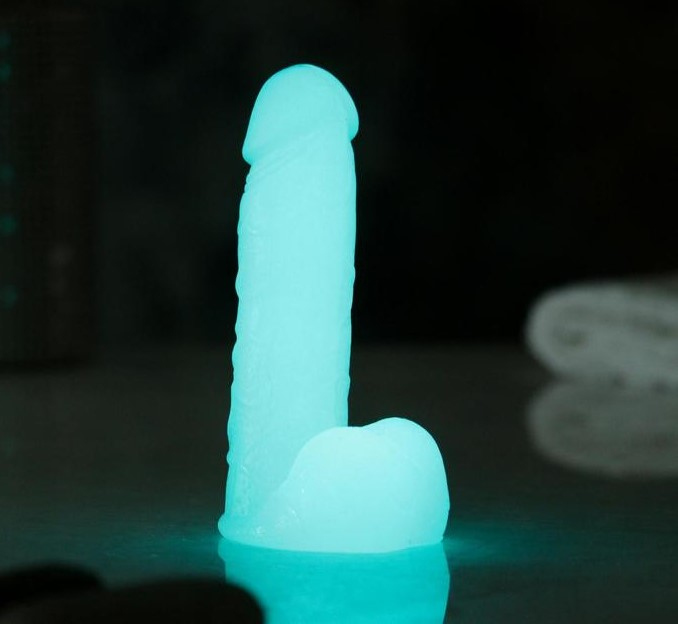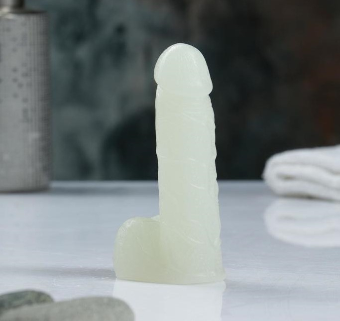 Фигурное мыло в виде члена, ручной работы, с выраженной головкой, ствол усыпан венками и для полной реалистичности мошонка. Это мыло светится в темноте.