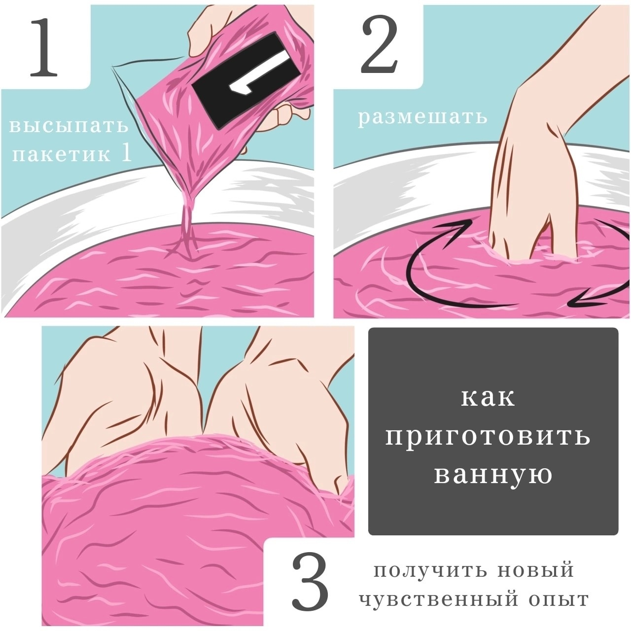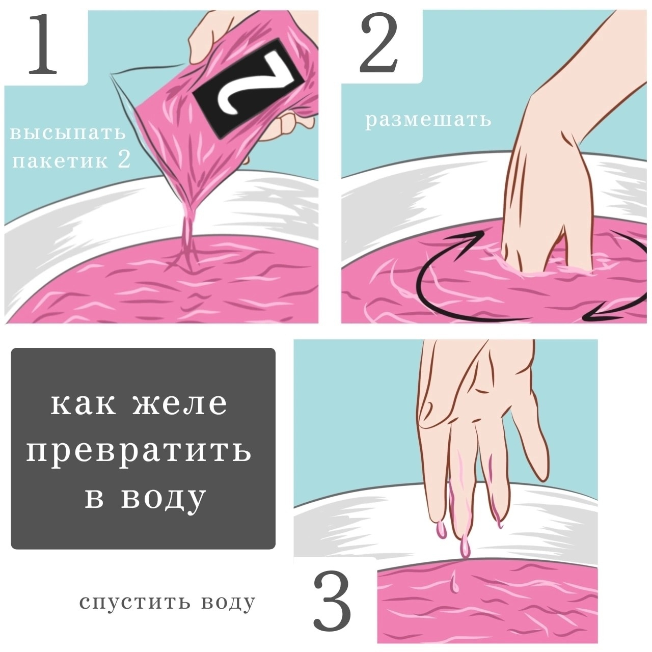 Осталось все это удалить из ванны, для этого есть второй пакетик, который необходимо рассыпать по всей ванне и размешать рукой. Желе превратиться в воду и можно все смыть в водосток. Если не хватило содержимого второго пакетика, можете взять обычную соль и посыпать ей.