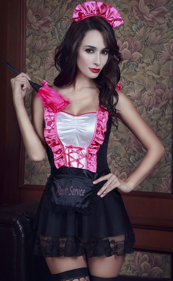 Костюм горничной выполнен в нестандартом цвете, черный прекрасно сочетается с розовым и добавляет вам изюминки.