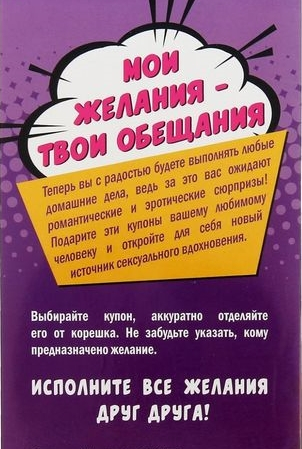 Исполните все желания второй половинки! В наборе вы найдёте купоны для неё и для него. Выбирайте желание на любой вкус и дарите неземное наслаждение друг другу!