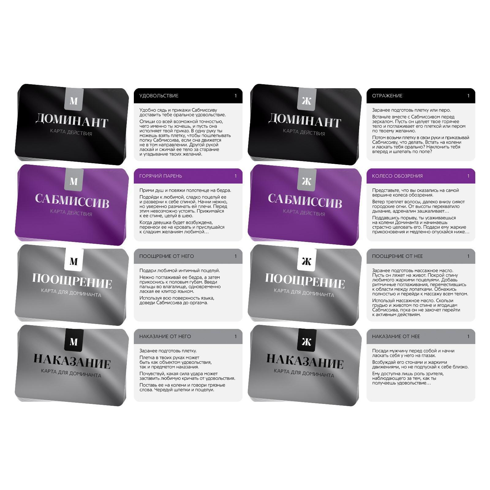 Одному из вас достанется роль доминанта, а второй будет сабмиссивом. Вытягивайте карточки из своей колоды и воплощайте в реальность сценарии соблазнения. В любой момент доминант сможет начать активные действия — поощрения или наказания. Играйте и дарите друг другу удовольствие!