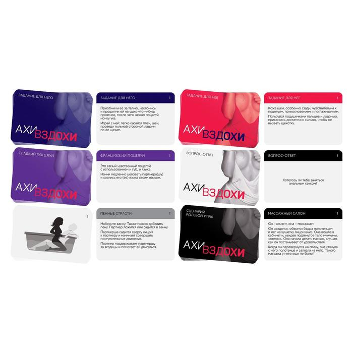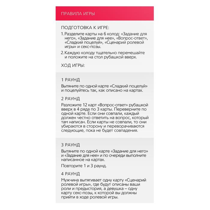 Любовное приключение - Эта игра поможет вам освежить свои отношения и погрузиться, как в первый раз, в пучину необузданных страстей. Внутри вы найдёте карты с волнующими вопросами и откровенными заданиями, сценарии для ролевых игр и карты с горячими секс-позами.