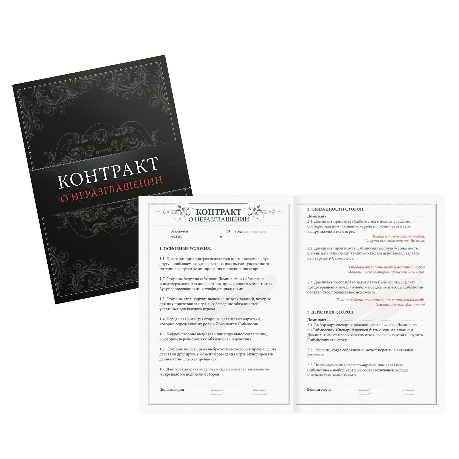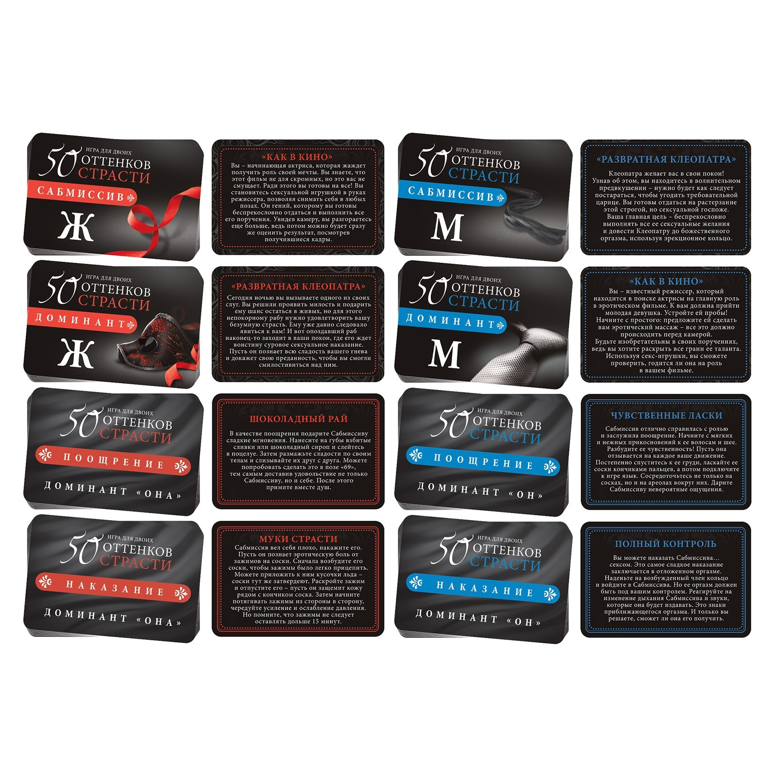 Для начала распределите роли и вручите друг другу по контракту. Кто-то из вас будет доминантом, а другой — сабмиссивом. Разыграйте один из жарких ролевых сценариев. А после решите, поощрения или наказания заслуживает сабмиссив. Вытягивайте карточки из соответствующих колод и воплощайте все фантазии в жизнь! А испытать наивысшее наслаждение от игры вам помогут горячие аксессуары.
