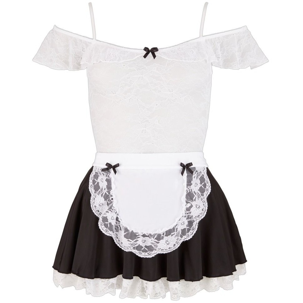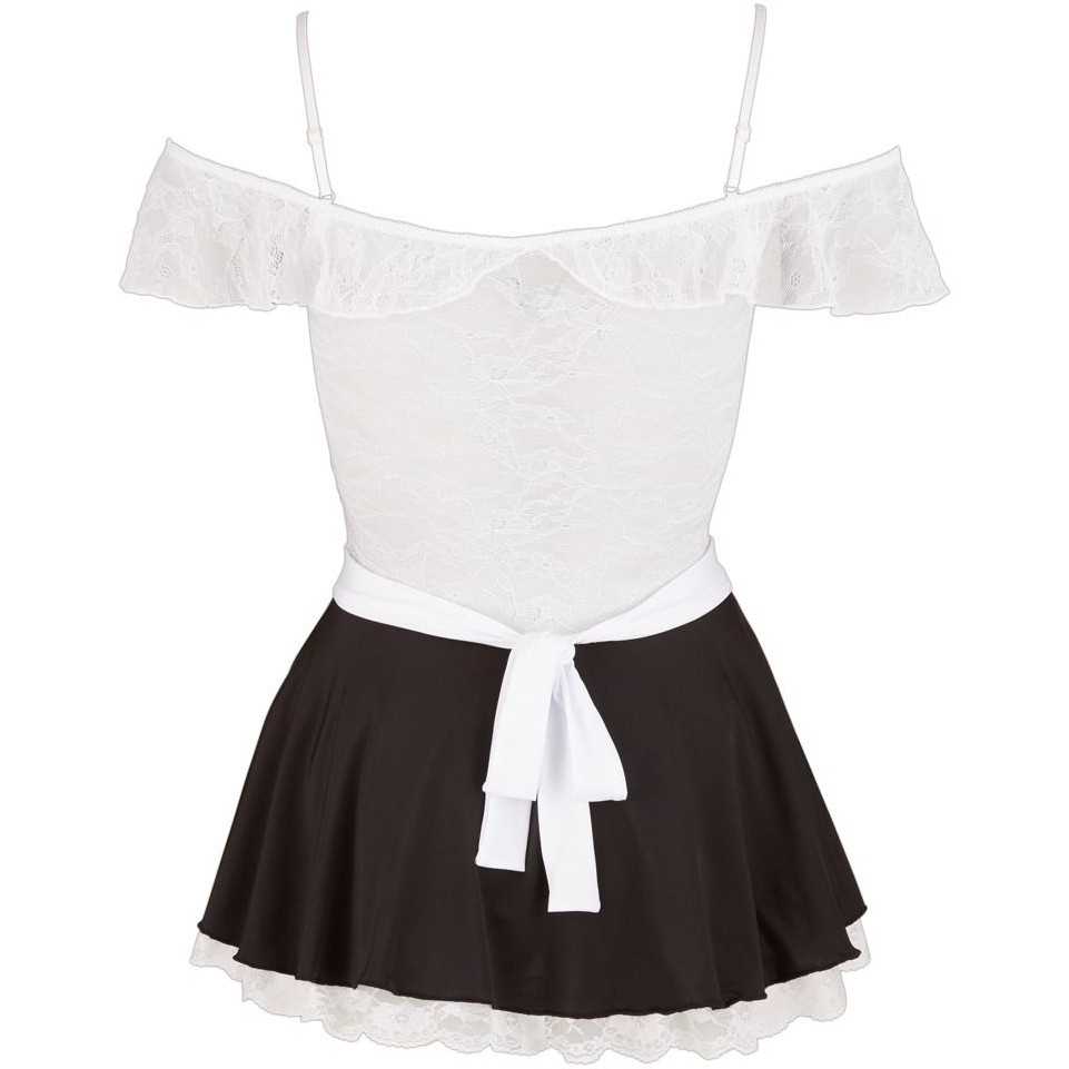 Верх выполнен из белого кружева, тонкие бретельки регулируются, а кружевные рукава можно снимать с плеч. Непрозрачная черная юбка слегка расклешена, и любой, кто приглядится повнимательнее, сможет увидеть немного белого кружева – дерзко и соблазнительно! Прилагаемый фартук, который можно завязать сзади, добавляет завершающий штрих к этому сексуальному наряду.
