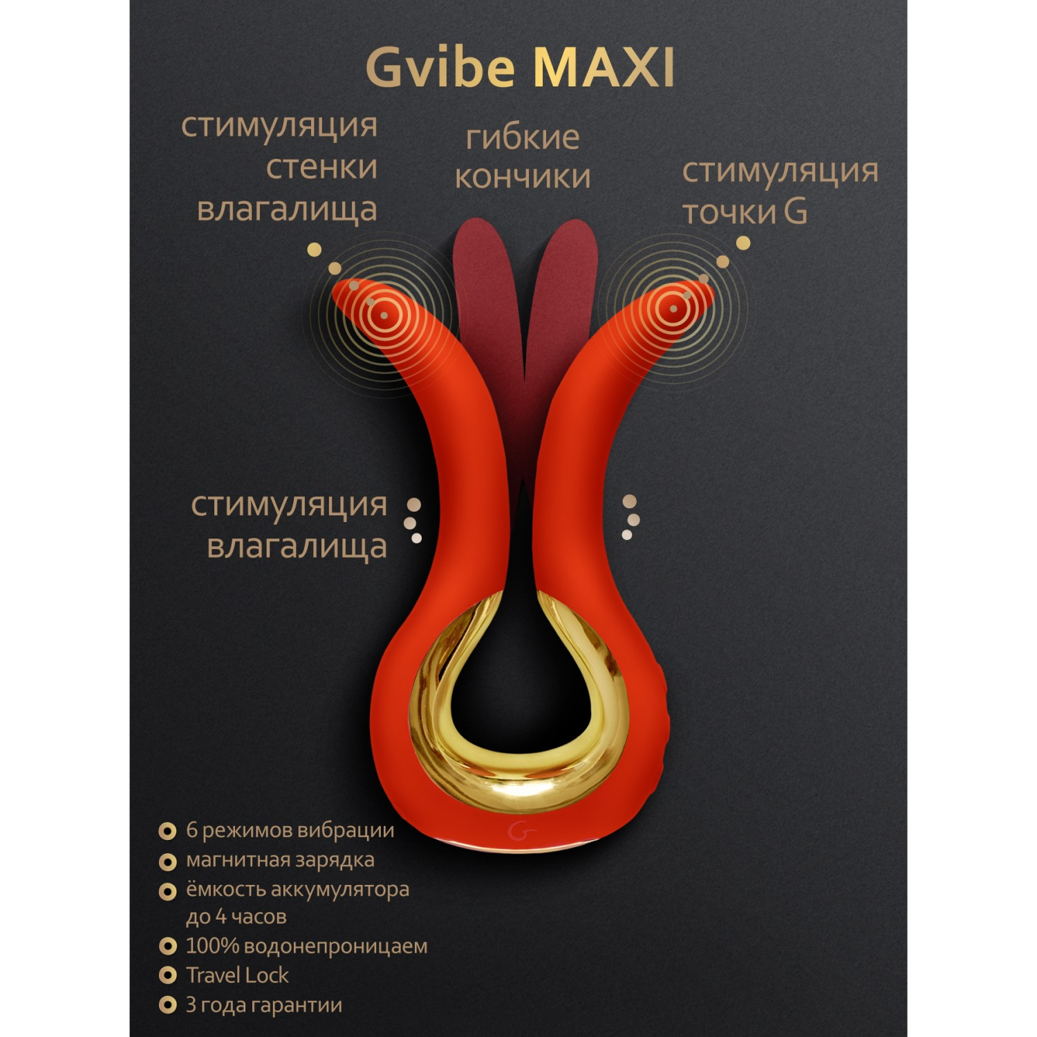 Gvibe Maxi увеличенная и более мощная версия нашего бестселлера Gvibe mini, с таким же удобным инновационным дизайном и раздельным валом. Gvibe Maxi обеспечивает более интенсивную одновременную двойную стимуляцию и двойное проникновение. Это идеальный универсальный стимулятор для пар и путешествий, с ярким дизайном и роскошной золотистой отделкой.