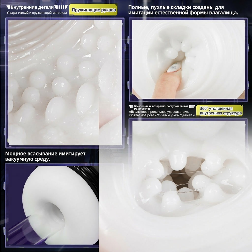 Включите устройство и ощутите, как внутренний рукав из гипоаллергенного силикона премиум‑класса мягко обволакивает, даря нежность и комфорт. Материал настолько реалистичен, что грань между искусственным и живым стирается в первые секунды.