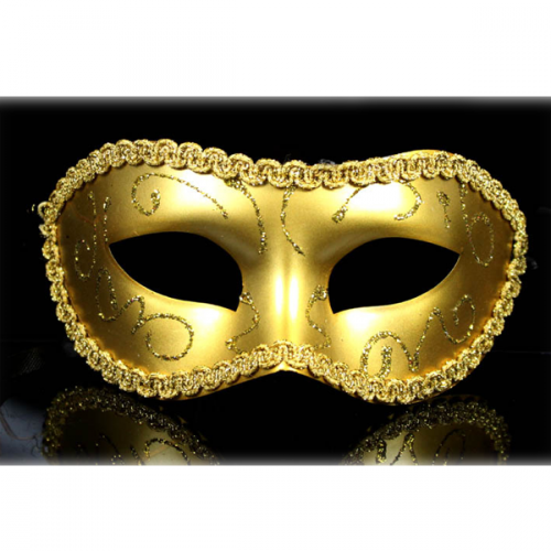 Карнавальная маска золотистого цвета из пластика, декорированная тесьмой. Прекрасно и изящно будет смотреться на вашем лице, что добавит чуть-чуть загадки.