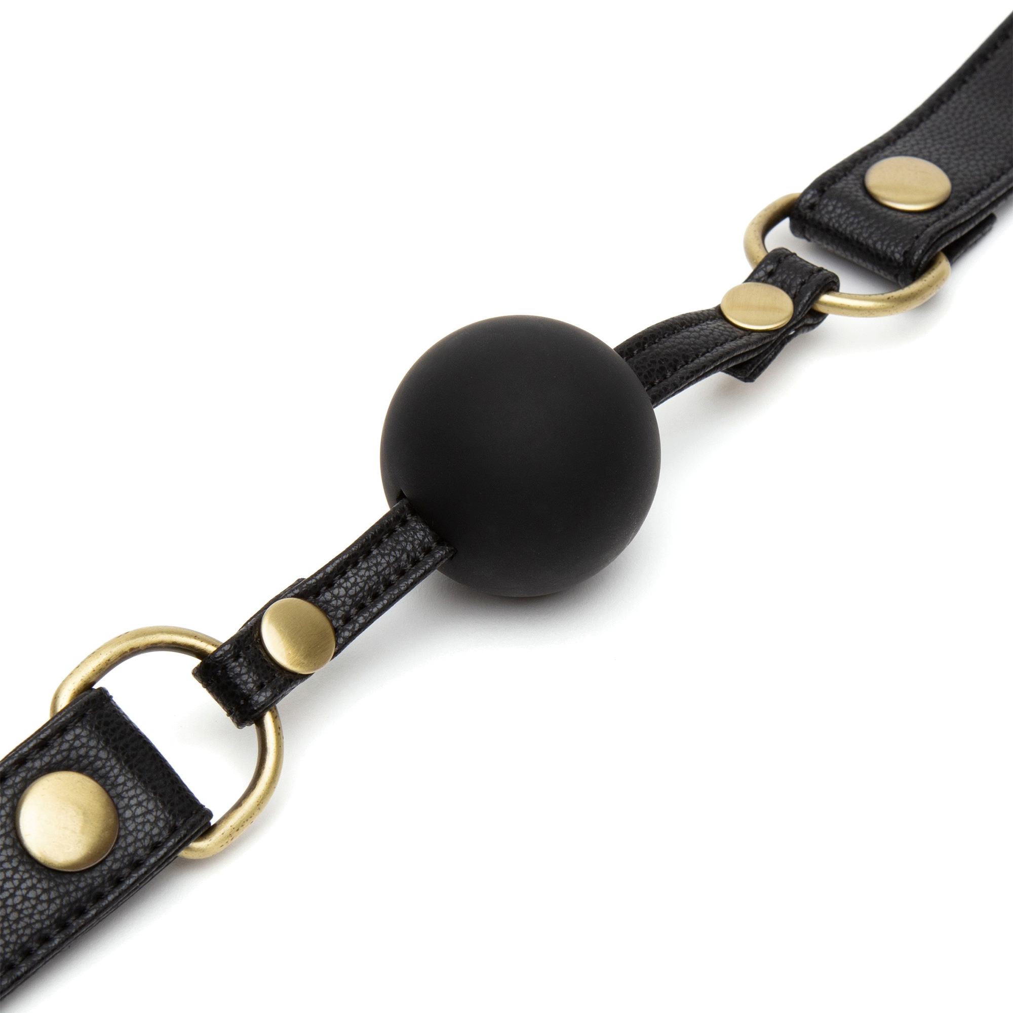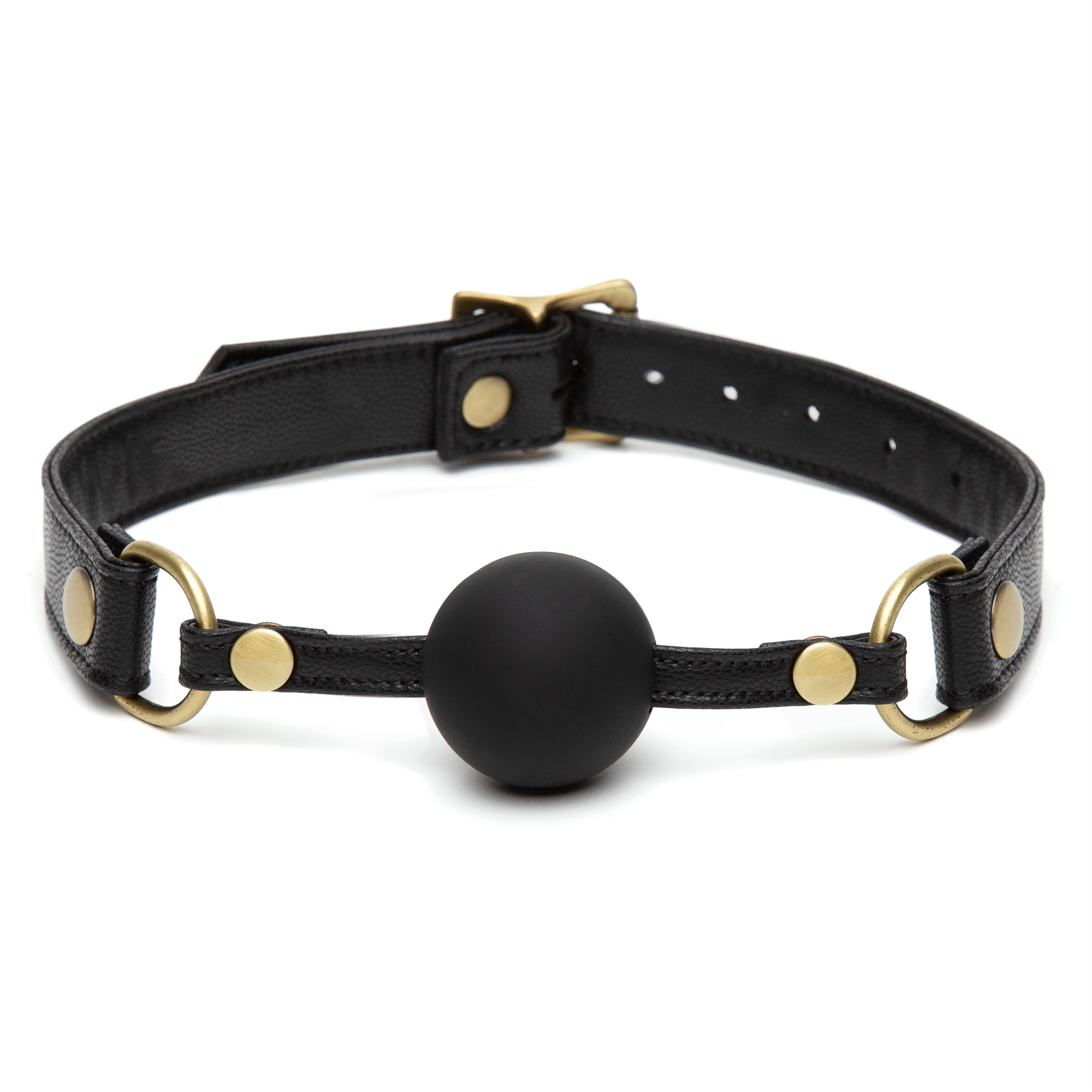 Кляп очень стильный, прочный и надежный. Регулируемый ремешок сделан из искусственной эко кожи черного цвета с позолоченными металлическими заклепками. Регулировать размер можно с помощью пряжки, поэтому игрушка подойдет для многих.