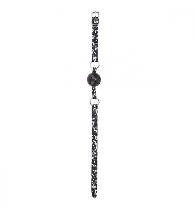 Эффектный кляп-шарик Love Street Art Fasion в современном, молодежном стиле. Модель отличается выразительно украшенным ремешком черного цвета, на который нанесены белые абстрактные изображения.