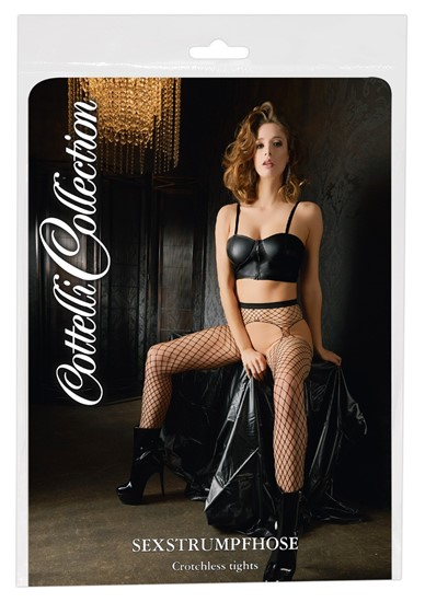 Колготки черного цвета, в очень крупную сетку - эффектно обовьют ваши стройные ножки и подожгут возбуждение. Полностью открыты для разных типов ласк, просто не снимая их.