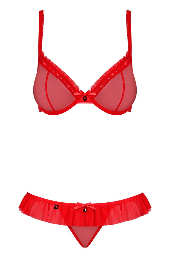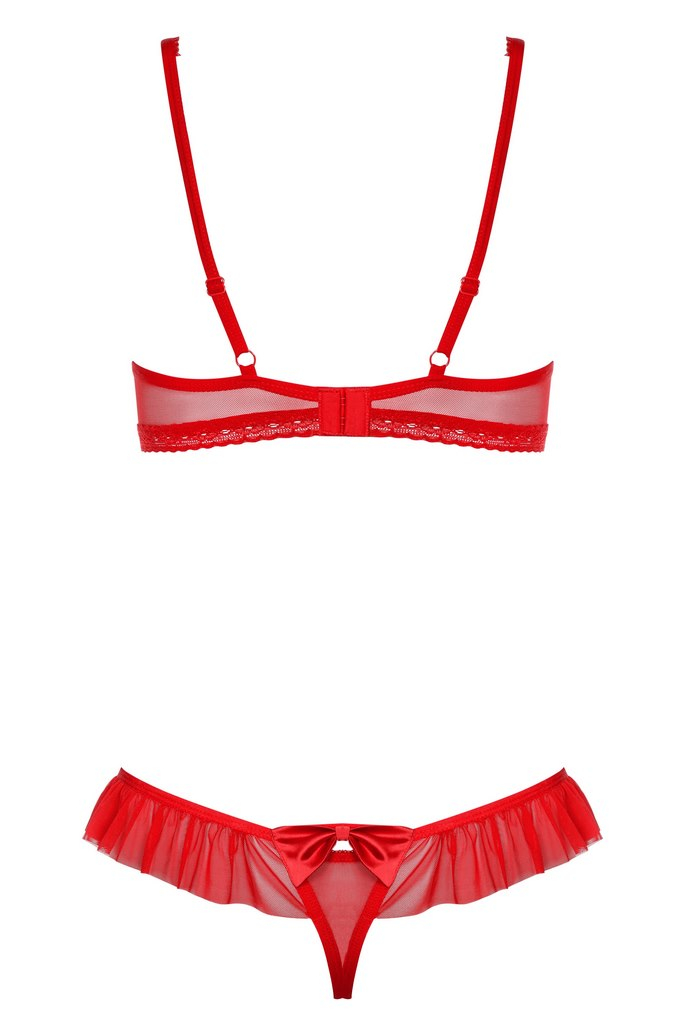 Женственный и очаровательный комплект. Бюст из прозрачной вуали с косточками, на тонких бретелях, регулирующихся по длине. На спине застежка-удлинитель. Трусики-стринг декорированы оборкой и бантом.